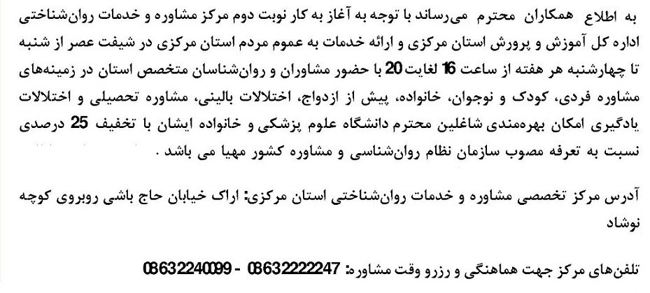 مرکز تخصصی مشاوره وخدمات روانشناختی ۱۲ آبان ۱۴۰۳ | ۱۳:۰۴ کد : ۴۷۳۷۱ اطلاعیه ارسال به دیگران نام شما ایمیل شما ایمیل دریافتکننده ارسال انصراف تعداد بازدید:۱۰۰۵۰ آغاز به کار نوبت دوم (شیفت عصر) مرکز تخصصی مشاوره و خدمات روانشناختی اداره کل آموزش و پرورش استان مرکزی و ارائه خدماات با تخفیف ۲۵ درصدی به شاغلین دانشگاه علوم پزشکی