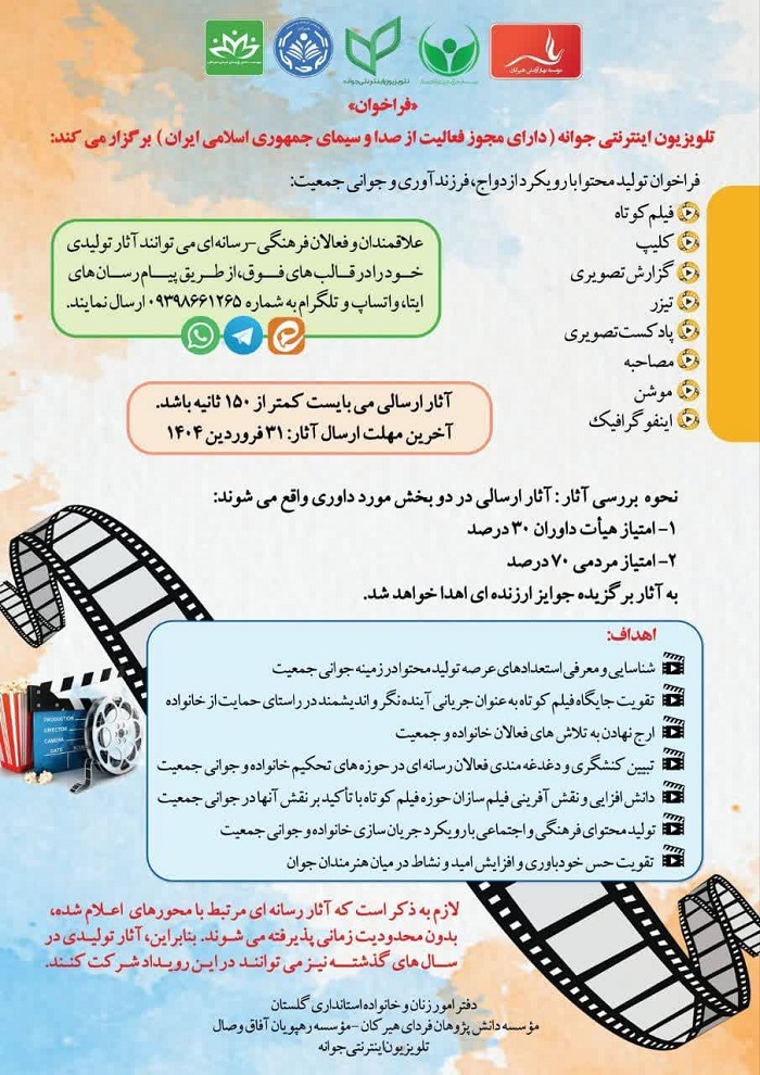 فراخوان دفتر امور زنان و خانواده استانداری گلستان با عنوان " تلویزیون اینترنتی جوانه "  پیرامون تولید محتوا با رویکرد ازدواج ، فرزندآوری و جوانی جمعیت به پیوست می باشد.