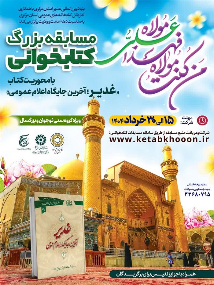 به اطلاع میرساند اداره کل کتابخانه های عمومی استان مرکزی در نظر دارد با همکاری بنیاد بین المللی غدیر استان، به مناسبت دهه مبارک امامت و ولایت، مسابقه کتابخوانی با محوریت کتاب " غدیر؛ آخرین جایگاه اعلام عمومی " ویژه رده سنی نوجوان و بزرگسال برگزار نماید.