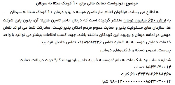 درخواست حمایت مالی، برای ۱۰ کودک مبتلا به سرطان ۰۷ بهمن ۱۴۰۴ | ۱۱:۳۳ کد : ۵۷۷۳۲ اطلاعیه ارسال به دیگران نام شما ایمیل شما ایمیل دریافتکننده ارسال انصراف تعداد بازدید:۱۰۱ موسسه خیریه حامی یار، درخواست حمایت مالی، برای ۱۰ کودک مبتلا به سرطان را دارد.