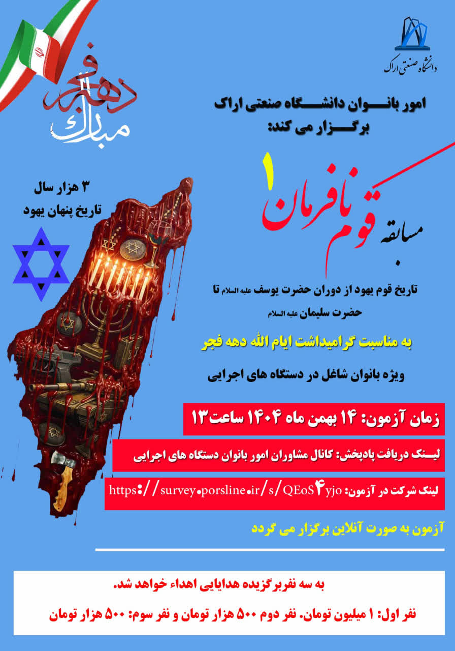 مسابقه قوم نافرمان ۰۸ بهمن ۱۴۰۴ | ۱۰:۳۹ کد : ۵۷۷۴۳ اطلاعیه ارسال به دیگران نام شما ایمیل شما ایمیل دریافتکننده ارسال انصراف تعداد بازدید:۱۲۲ برگزاری مسابقه قوم نافرمان، در ایام الله دهه فجر